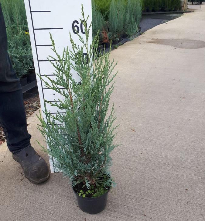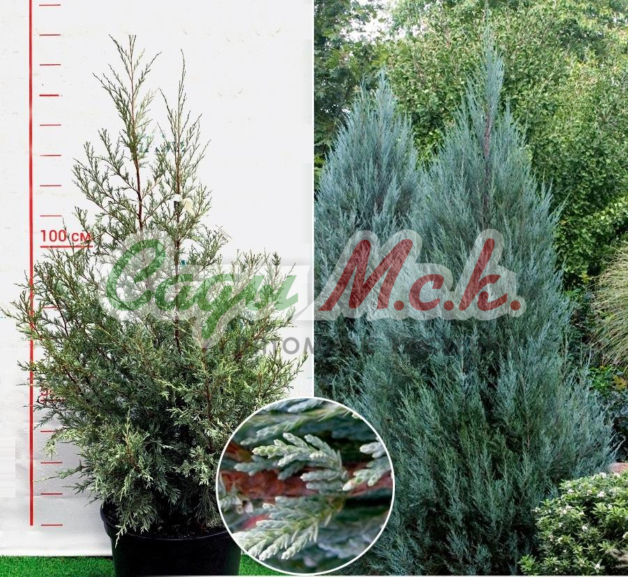 Это скальный можжевельник, который, согласно описанию, способен достигать 18 м в высоту и 2 м в диаметре. Однако таких внушительных габаритов растение достигает только в естественной среде обитания, а в городских посадках его размеры намного скромнее – можжевельник ниже и тоньше, но это никак не уменьшает декоративность сорта. Крона конического типа начинается практически от земли, но по мере роста начинает постепенно округляться. Побеги текущего года имеют глубокий голубовато-зеленый или светло-голубой цвет. Длина хвои достигает 12 мм в длину и 2 мм в ширину, после цветения можжевельника формируются плоды – их внешний вид напоминает шарики темно-синего колера, внутри шишкоягод образуются красновато-бурые семечки, вырастающие до 5 мм. Ежегодный прирост составляет примерно 15–20 см.