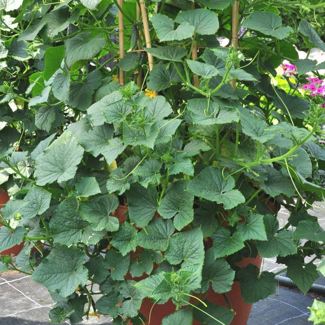 Замечательный гибрид огурца: кустовой, очень раннеспелый (45 дней), плети не превышают в длину 60см, что дает возможность выращивать его в условиях ограниченного пространства – в горшках и контейнерах с обеспечением опоры, а также в подвесных корзинах как ампельное растение. Плоды цилиндрические, в молодом возрасте с многочисленными шипами и белыми полосками, по мере роста не «раздуваются». Гибрид имеет универсальное использование: огурцы, достигшие длины 8-13см, отлично подходят для маринования, а оставленные на растении продолжают расти до 17-17,5см длиной и после сбора могут использоваться в свежем виде для закусок и салатов, долго сохраняют товарные качества. Частые сборы стимулируют новое плодообразование.