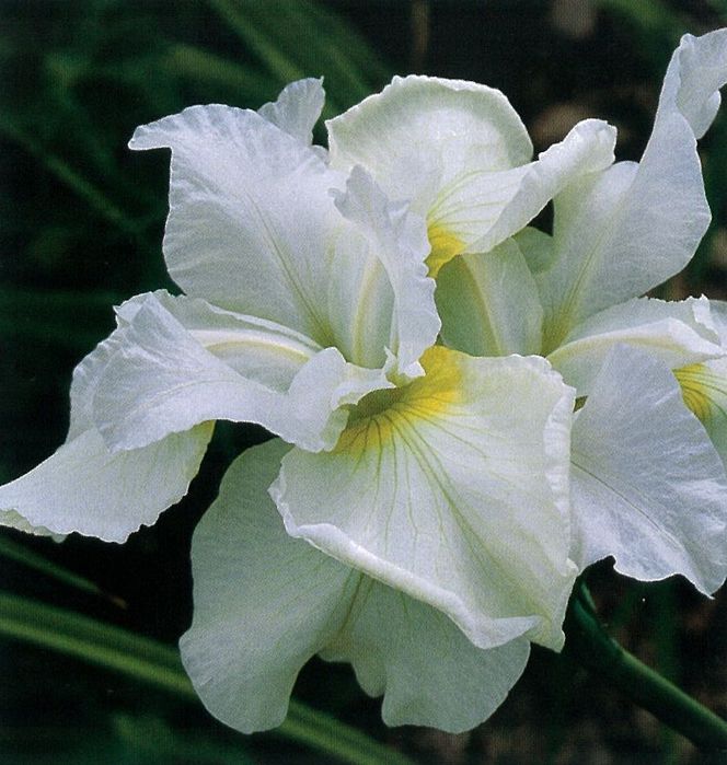 Ирис Harpswell Happiness обладает белыми стандартами, куполообразными с золотистой каймой по краям. Фолы- белые с сине – фиолетовыми прожилками, радиально отходящих от золотистых плеч по обе стороны оранжево – мандариновой бородкой и кремово – бежевой каймой, гофрированный.