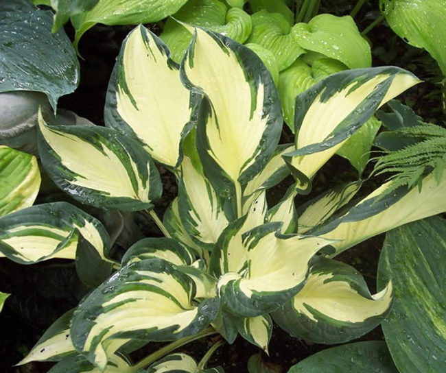 Хоста Dаnсing in thе Rаin – медленно растущая, крупная хоста, привлекающая внимание цветоводов своими потрясающе красивыми листьями. Рифленые, крупные, имеющие сердцевидную форму они образуют шикарный плотный куст, достигающий в ширину 1 м. Удивляет не только форма, а и окраска листовых пластин: белоснежный центр и неровная двухцветная кайма – сине-зеленая, со штрихами травянисто-зеленого цвета. При сильной жаре белый цвет может постепенно изменяться до светло-зеленого. На фоне пестрой зелени эффектно выглядят небольшие бледно-лавандовые, практически белые цветы. Растение растет медленно, но ожидание того стоит.