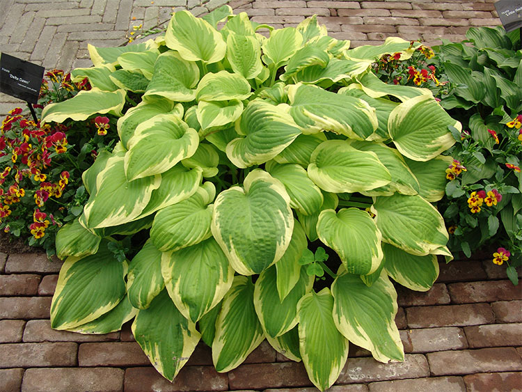 Хоста Dеltа Dаwn – декоративный, травянистый, хорошо разрастающийся, плотный куст высотой до полуметра. У него очень большие, овально-продолговатые, закручивающиеся на конце рифленые листы, которые с возрастом могут распрямиться. Но внимание в основном акцентируется на окраске листовых пластин, а не на их форме. По самому краю салатно-зеленого фона с четко выраженными жилками проходит контрастная ярко-белая кайма, которая со временем желтеет и к осени приобретает насыщенный желтый цвет. Если хоста высажена на кислых почвах или в глубокой тени, то интенсивность золота будет не таким сильным. С июля растение начинает обильно и долго цвести, выпуская длинные цветоносы с бледными лавандовыми цветами. Сорт неприхотлив, устойчив, зимует без укрытия и легко переносит морозы.