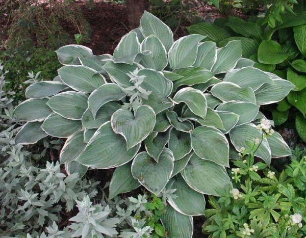 Хоста Tоm Sсhmid – яркий представитель гигантских сортов многолетников данного вида. Его огромные, удлиненные листы, доходящие в длину до 30 см, не стелятся по земле, а высоко подняты, тем самым образуя огромные кусты, по форме напоминающие метровые вазы. Окраска листовой пластины тоже очень декоративна. Разве не вызовут восхищение огромные серебристо-голубые листья с белоснежной каймой и легким восковым налетом? На таком фоне появившиеся в июле изящные нежно-лавандовые цветки будут выглядеть потрясающе эффектно. Сорт просто очаровывает своей необычной красотой. Это великолепный выбор для ландшафтного дизайна, когда высокие кусты-вазы будут отлично смотреться в ажурной тени сада.