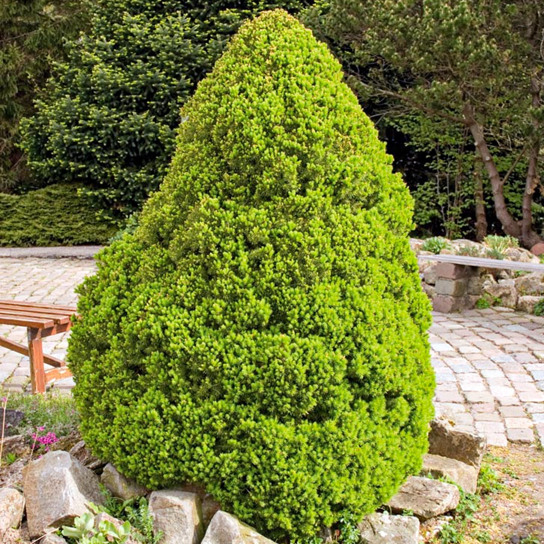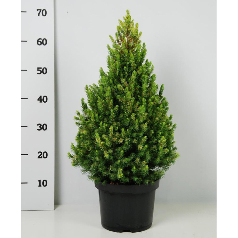 Карликовая конусовидная форма ели. Достигает высоты 2 м, диаметра кроны 1 м. Хвоя игольчатая, радиальная, редко расположенная, 10 мм длиной, очень мягкая, светло-зеленая. Растет на свежих или влажных, умеренно богатых питательными веществами почвах, от кислых до щелочных. Светолюбива, выносит полутень. Особенности: Ель канадская Коника Спиди декоративна благодаря правильной, конической форме кроны. Плохо переносит уплотнение и переувлажнение почвы. Морозостойка. Одно из лучших и популярнейших растений для каменистой горки, используется для выращивания в контейнерах на крышах и террасах, для одиночных и групповых посадок, альпинариях. Высота саженца 30-40 см.